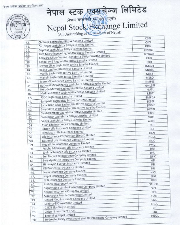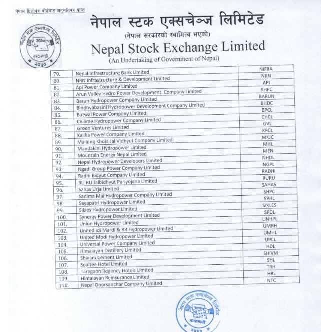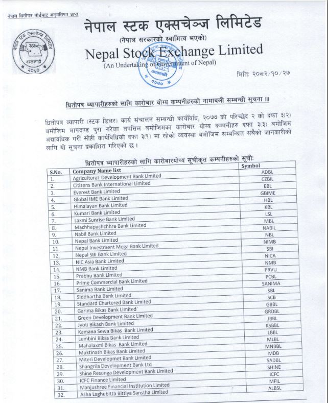 नेप्सेले सार्वजनिक गर्यो धितोपत्र व्यापारीका लागि कारोबार योग्य ११० कम्पनीको नाम