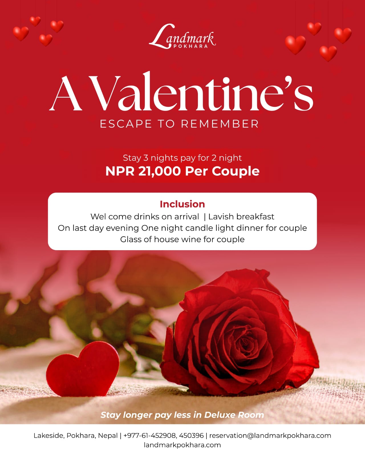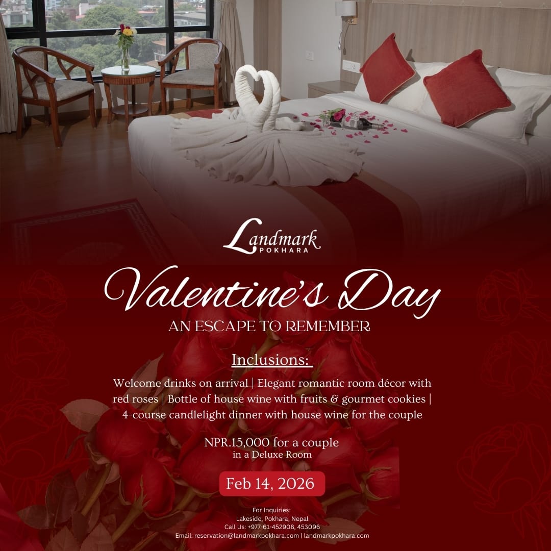 आगामी फेब्रुअरी १४ अर्थात् भ्यालेन्टाइन डे लाई लक्षित गर्दै ल्याण्डमार्क ग्रुपले पोखरामा २ रातकै खर्चमा ३ रातको बास र क्याण्डललाइट डिनरसम्मको व्यवस्था गरेको छ । पोखराबाहेक चितवनको सौराहा तथा नारायणगढ, देवघाट र भैरहवामा समेत भ्यालेन्टाइन डे अफर सार्वजनिक गरेको हो ।