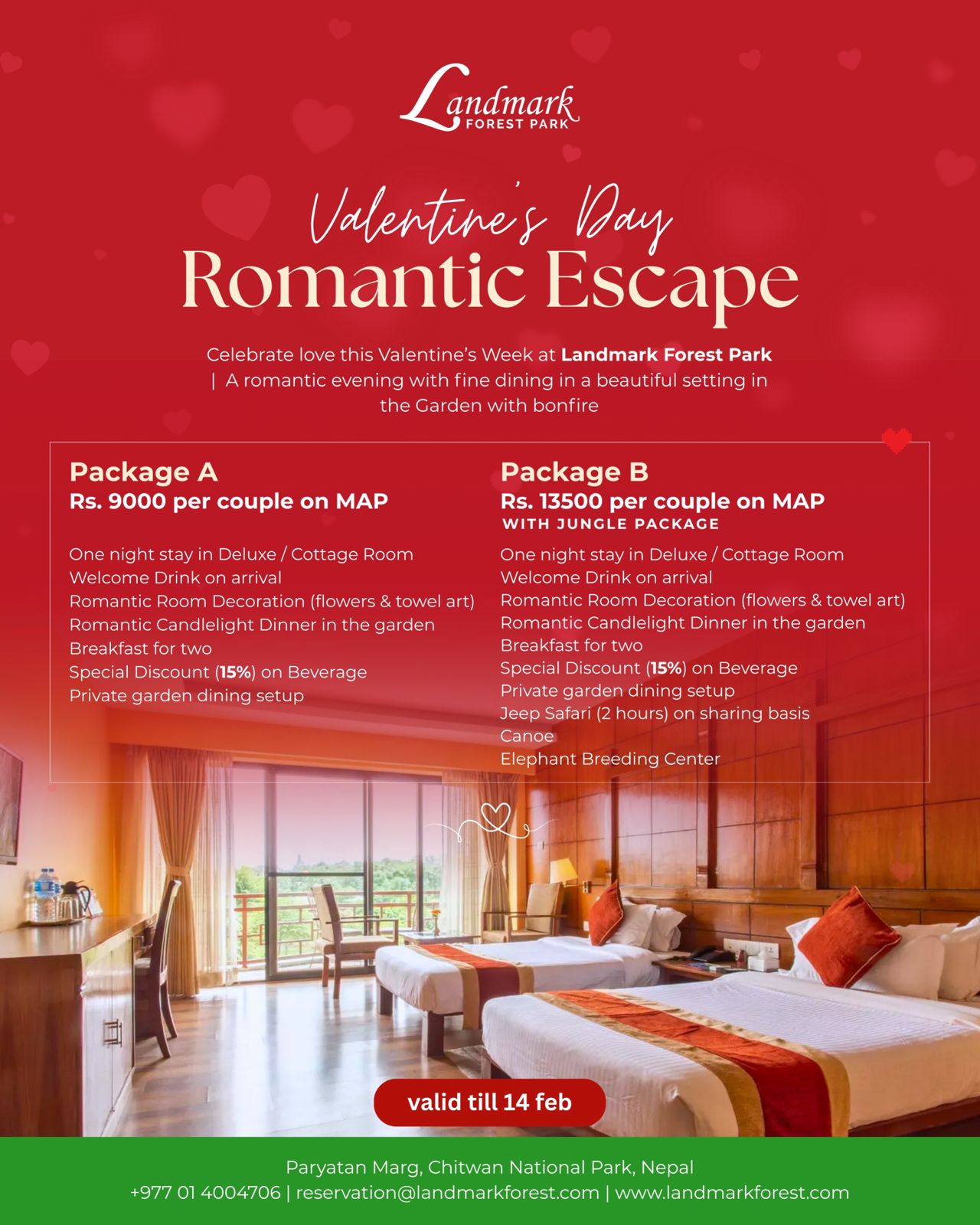 प्याकेज अन्तर्गत २१ हजार रुपैयाँमा ३ दिनको ब्रेकफास्टसहितको बास पाइनेछ । पहिलो दिन होटेलले वेलकम ड्रिंक्स उपलब्ध गराउनेछ । भ्यालेन्टाइन डे वा जाने अघिल्लो दिन राति क्याण्डललाइट डिनर र एक बोतल वाइनसमेत उपलब्ध गराउनेछ । यो अफरमा ३ रात बस्दा २ रातको मात्रै रकम तिरे पुग्नेछ । ल्याण्डमार्क पोखरामा सामान्य अवस्थामा ब्रेकफास्टसहितको डिलक्स रुमको शुल्क प्रति रात १२ हजार रुपैयाँ रहेको छ ।