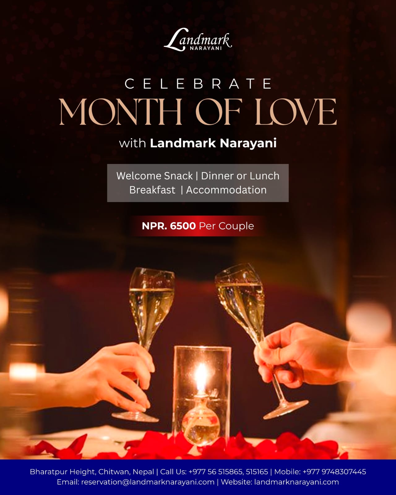 फेब्रुअरी ७ बाट भएको भ्यालेन्टाइन साता समेतलाई लक्षित गर्दै ल्याण्डमार्कले आफ्नो ग्रुपका होटेल, रिसोर्ट तथा फार्म हाउसमा अफरहरू सार्वजनिक गरेको हो । ल्याण्डमार्कले आफ्नो भरतपुर हाइट चितवनमा रहेको ल्याण्डमार्क नारायणीमा मन्थ अफ लभका रूपमा महिनाभरि कै लागि एउटै मूल्यमा अफर सार्वजनिक समेत गरेको छ । अफरमा भ्यालेन्टाइन डे सजावटसहितको डिलक्स रुम, वेलकम ड्रिंक्स, एक बोतल वाइन, क्याण्डललाइट डिनर, ल्याभिस ब्रेकफास्ट आदि समावेश गरिएको छ ।