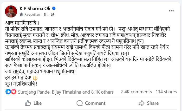 यो पवित्र रात्रि उपवास, जागरण र अन्तर्मनबीच संवाद गर्ने पर्व हो। ‘पशु’ अर्थात् बन्धनमा बाँधिएको चेतनालाई मुक्त गराउने र लोभ, क्रोध, मोह, अहंकार लगायत सबै पाश(बन्धन)हरूबाट निकालेर मनलाई स्वतन्त्र, शान्त र आनन्दित बनाउने प्रतीकात्मक स्वरूप नै पशुपतिनाथ हुन् ।ऊर्जाको तेजमय प्रवाहलाई संयममा राख्ने सामर्थ्य, विषको पीडा सामना गरेर पनि शान्त रहने धैर्य र नश्वरता सम्झँदै अनासक्त जीवन जिउने सन्देश पशुपतिनाथले दिएका छन् । बाहिरको कोलाहलमा होइन, भित्रको विवेकमा सत्य निहित छ। आजको यस दिनमा सबैले विवेकको सत्य फेला पार्न सकुन् र आत्मबोधको ज्योति प्रज्ज्वलित होओस्। जय राष्ट्रदेव, महादेव भगवान पशुपतिनाथ ! हर हर महादेव! 🔱 शुभ महाशिवरात्रि !