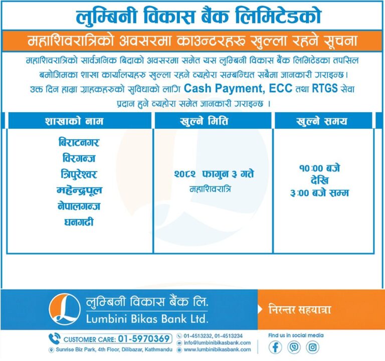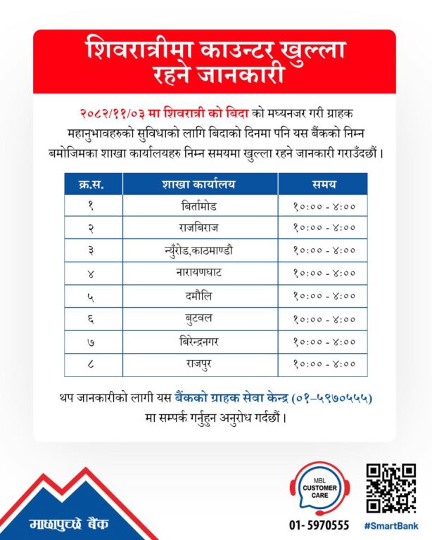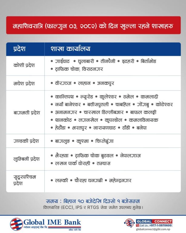 ३ माघ, काठमाडौं । सरकारले आज महाशिवरात्रि पर्वको अवसरमा देशभर सार्वजनिक बिदा दिएको छ। बिदाका दिन सेयर बजार, बैंक तथा वित्तीय संस्था, सरकारी कार्यालय तथा शिक्षण संस्था बन्द रहनेछन्।