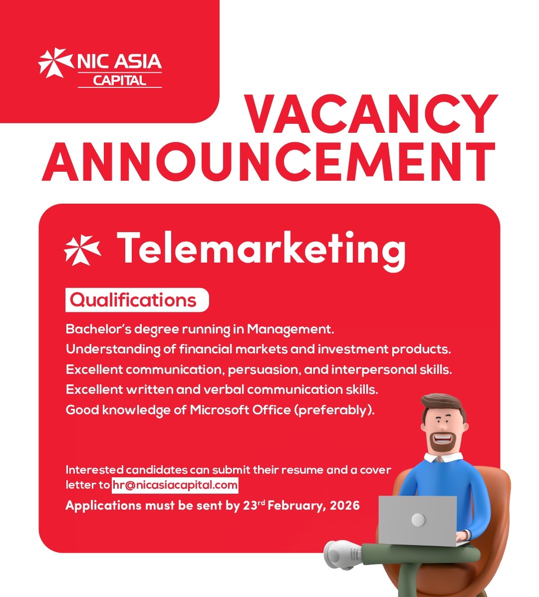 ४ फागुन, काठमाडौँ । एनआईसी एशिया क्यापिटलले कर्मचारी माग गरेको छ। कम्पनीले एक सूचना जारी गर्दै टेलिमार्केटिङ पदका लागि कर्मचारी माग गरेको हो ।