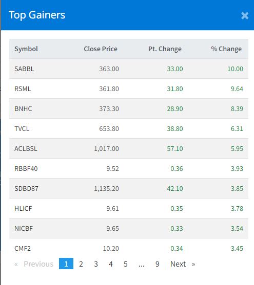 मंगलबार ४२ कम्पनीको सेयर मूल्य बढेको छ भने २१४ कम्पनीको घटेको छ । ६ कम्पनीको सेयर स्थिर रहेको हो । आज सालपा विकास बैंकको सेयर मूल्यमा सकारात्मक सर्किट लागेको छ । साथै, यस दिन रिलायन्स मिल्सको सेयर मूल्य ९.६४ प्रतिशत, बुद्धभुमी नेपालको सेयर मूल्य८.३९ प्रतिशत, त्रिशुली जलविद्युतको सेयर मूल्य ६.३१ प्रतिशत र आरम्भ चौतारी लघुवित्तको सेयर मूल्य ५.९५ प्रतिशतले बढेको छ ।