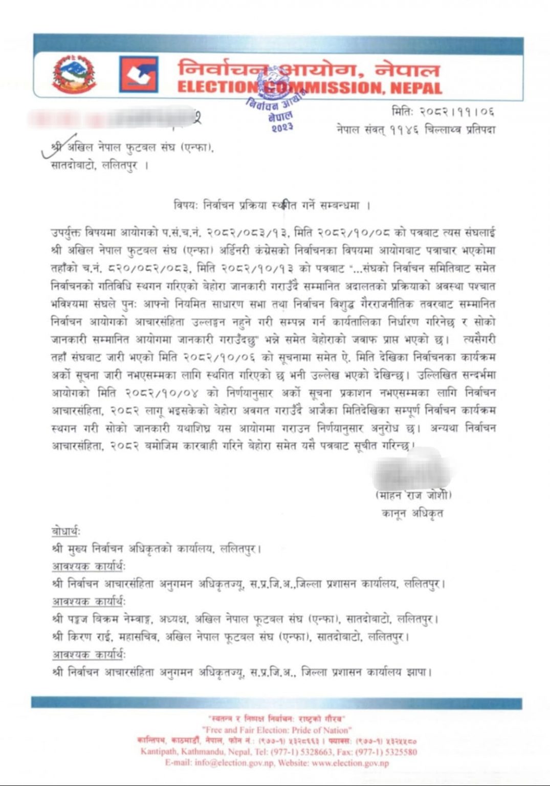६ फागुन, काठमाडौं । निर्वाचन आयोगले अखिल नेपाल फुटबल संघ (एन्फा)लाई निर्वाचन प्रक्रिया स्थगित गर्न निर्देशन दिएको छ। आयोगले पत्रमार्फत एन्फाको आसन्न निर्वाचनसम्बन्धी गतिविधि तत्काल रोक्न निर्देशन दिएको हो।