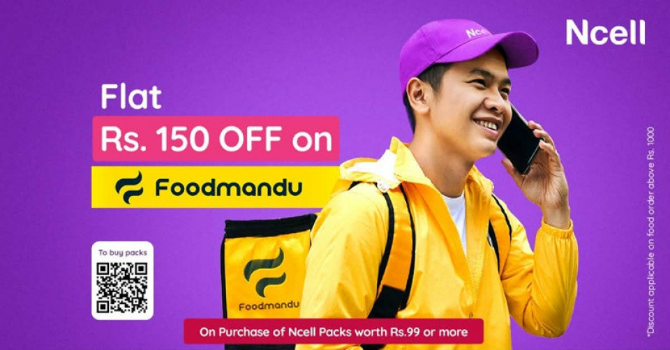 फागुन ५ देखि सञ्चालनमा आएको यो अफरमा, रु. ९९ वा सोभन्दा बढी मुल्य रहेका अफरमा समावेश कुनै पनि एनसेल प्याकको खरिदमा ग्राहकहरूले रु. १५० छुटको कुपन प्राप्त गर्दछन् । यो कुपन फुडमाण्डुमा रु. १ हजार वा सोभन्दा बढी मूल्यका विभिन्न परिकारका अर्डरमा प्रयोग गर्न सकिन्छ ।
