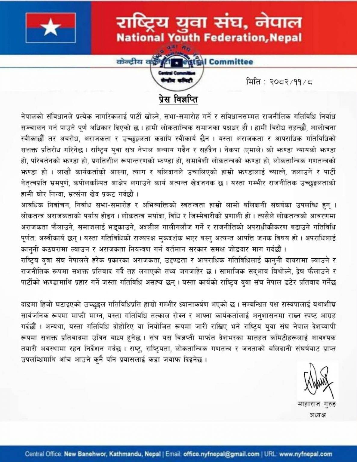 संघले नेपालको संविधानले प्रत्येक नागरिकलाई राजनीतिक दल खोल्ने, सभा–समारोह गर्ने र संविधानसम्मत गतिविधि सञ्चालन गर्ने अधिकार दिएको उल्लेख गर्दै लोकतान्त्रिक अभ्यासमाथि अवरोध सिर्जना गर्ने गतिविधि सह्य नहुने बताएको छ। विरोध र आलोचना स्वीकार्य भए पनि अराजकता र आपराधिक क्रियाकलापविरुद्ध सशक्त प्रतिवाद गरिने चेतावनी विज्ञप्तिमा दिइएको छ।