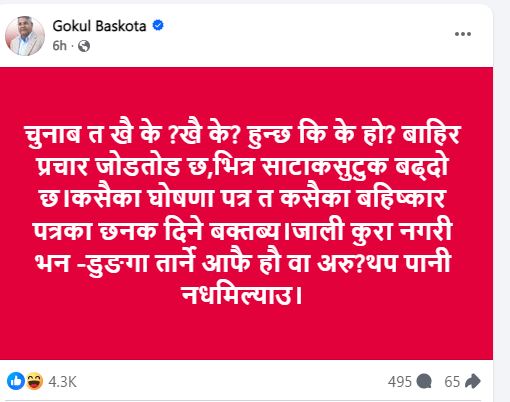 कसैका घोषणापत्र, कसैका बहिष्कारपत्रका छनक आउँदैछन्ः गोकुल बास्कोटा