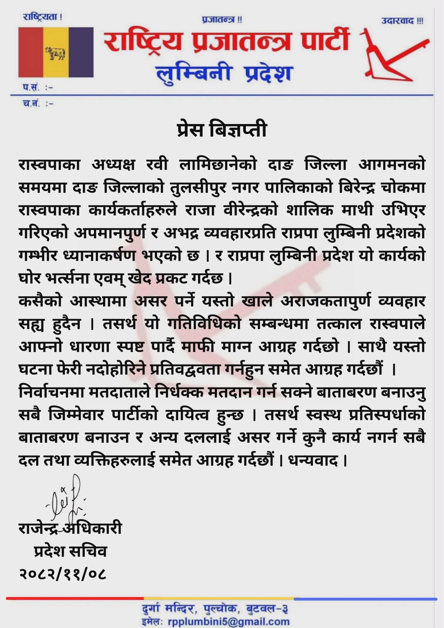 बिहीबार राति रास्वपाका सभापति रवि लामिछानेको दाङ आगमनको समयमा तुलसीपुर उपमहानगरपालिकाको बिरेन्द्रचोकमा रास्वपाका कार्यकर्ताहरुले राजा वीरेन्द्रको शालिकमाथि उभिएर अपमानपूर्ण र अभद्र व्यवहार गरेको भन्दै राप्रपा लुम्बिनी प्रदेशको गम्भीर ध्यानाकर्षण भएको बताएका छन् । राप्रपा लुम्बिनीले यो कार्यको घोर भत्र्सना एवं खेद प्रकट गरेको विज्ञप्तिमा उल्लेख छ ।