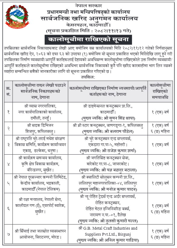 कार्यालयका अनुसार सार्वजनिक खरिद ऐन, २०६३ को दफा ६३ उपदफा (१) अनुसार उक्त निर्णय गरिएको हो। यस प्रावधानले ठेक्का सम्झौताअनुसार काम सम्पन्न नगर्ने, सर्त उल्लंघन गर्ने वा जिम्मेवारीमा लापरबाही गर्ने आपूर्तिकर्ता तथा निर्माण व्यवसायीलाई निश्चित अवधिका लागि कालो सूचीमा राख्ने व्यवस्था गरेको छ। कारबाहीमा परेका कम्पनीहरूमा डाइमेन्सनल कन्स्ट्रक्सन, थ्री–स्टार कन्स्ट्रक्सन, चुरे कन्स्ट्रक्सन एण्ड सप्लायर्स, जगतिसिंह कन्स्ट्रक्सन सेवा, क्वालिटी सोलुसन कम्पनी, न्यू रोहित ट्रेडर्स एण्ड अर्डर सप्लायर्स तथा जिबी मेटल क्राफ्ट इण्डस्ट्रिज एण्ड सप्लायर्स रहेका छन्।