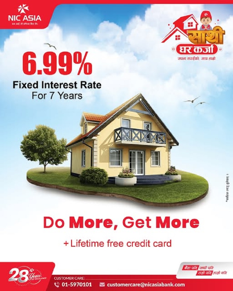 १३ फागुन, काठमाडौं । एनआईसी एशिया बैंकले आकर्षक ब्याजदरमा नयाँ ‘साथी घर कर्जा’ योजना सार्वजनिक गरेको छ। बैंकले ७ वर्षका लागि ६.९९ प्रतिशत स्थिर ब्याजदरमा घर कर्जा उपलब्ध गराउने जनाएको हो।