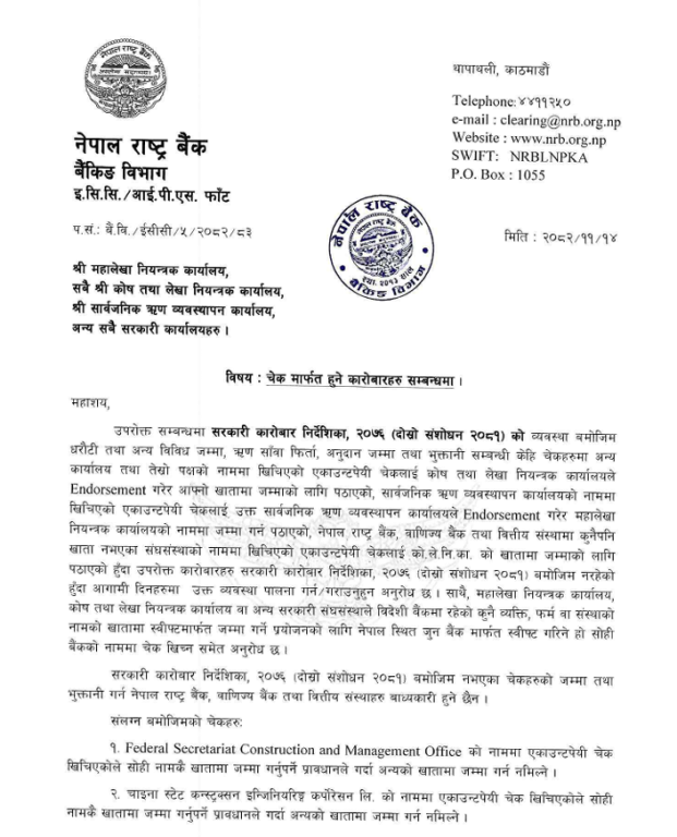 नयाँ व्यवस्था बमोजिम  राष्ट्र बैंकले अबदेखि जुनसुकै सरकारी कार्यालय वा संस्थाको नाममा खिचिएको ‘एकाउन्ट पेयी’ चेक सोही संस्थाको खातामा मात्र जम्मा गर्नुपर्ने स्पष्ट पारेको छ । यो व्यवस्था लागू गर्न केन्द्रीय बैंकले बैंक तथा वित्तीय संस्थाहरुलाई निर्देशन दिएको छ।