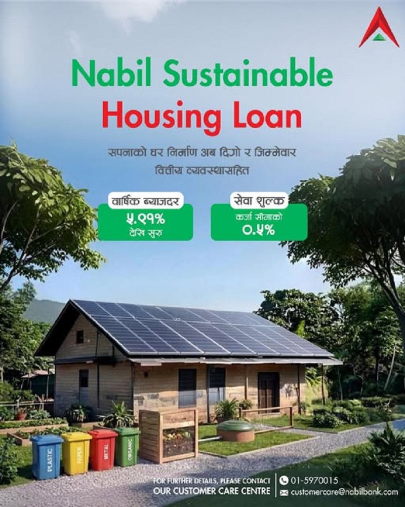 १५ फागुन, काठमाडौं। नबिल बैंक लिमिटेडले वातावरणमैत्री तथा दिगो घर निर्माणलाई प्रोत्साहन गर्ने उद्देश्यले ‘दिगो आवास कर्जा’ योजना सार्वजनिक गरेको छ।