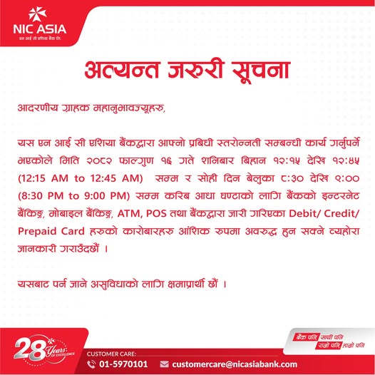 १५ फागुन, काठमाडौं। एनआईसी एशिया बैंकले आफ्नो प्रणाली स्तरोन्नति (सिस्टम अपग्रेड) गर्ने भएकाले केही समय बैंकका सेवाहरू आंशिक रूपमा अवरूद्ध हुने जनाएको छ।