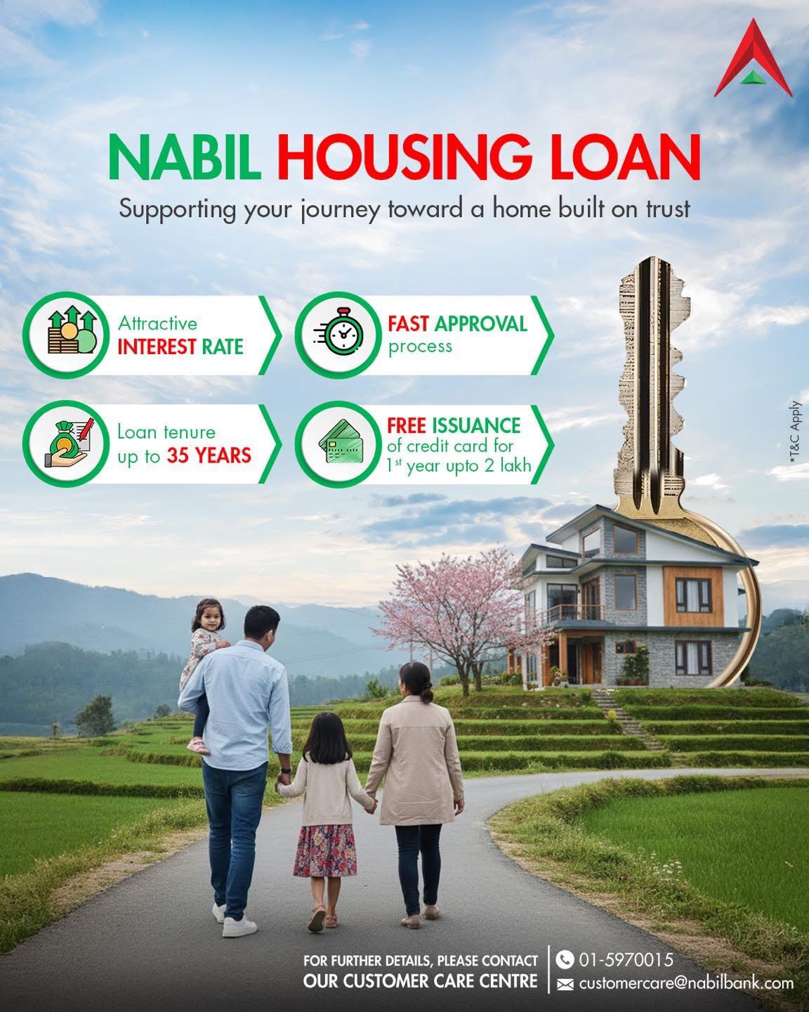 १५ फागुन, काठमाडौं। नबिल बैंकले घर निर्माण तथा खरिदका लागि ‘नबिल हाउजिङ लोन’ योजना सार्वजनिक गरेको छ। आफ्नै घर बनाउने सपना देखिरहेका ग्राहकलाई लक्षित गर्दै बैंकले आकर्षक ब्याजदर र सरल प्रक्रियासहित कर्जा सुविधा ल्याएको जनाएको छ।
