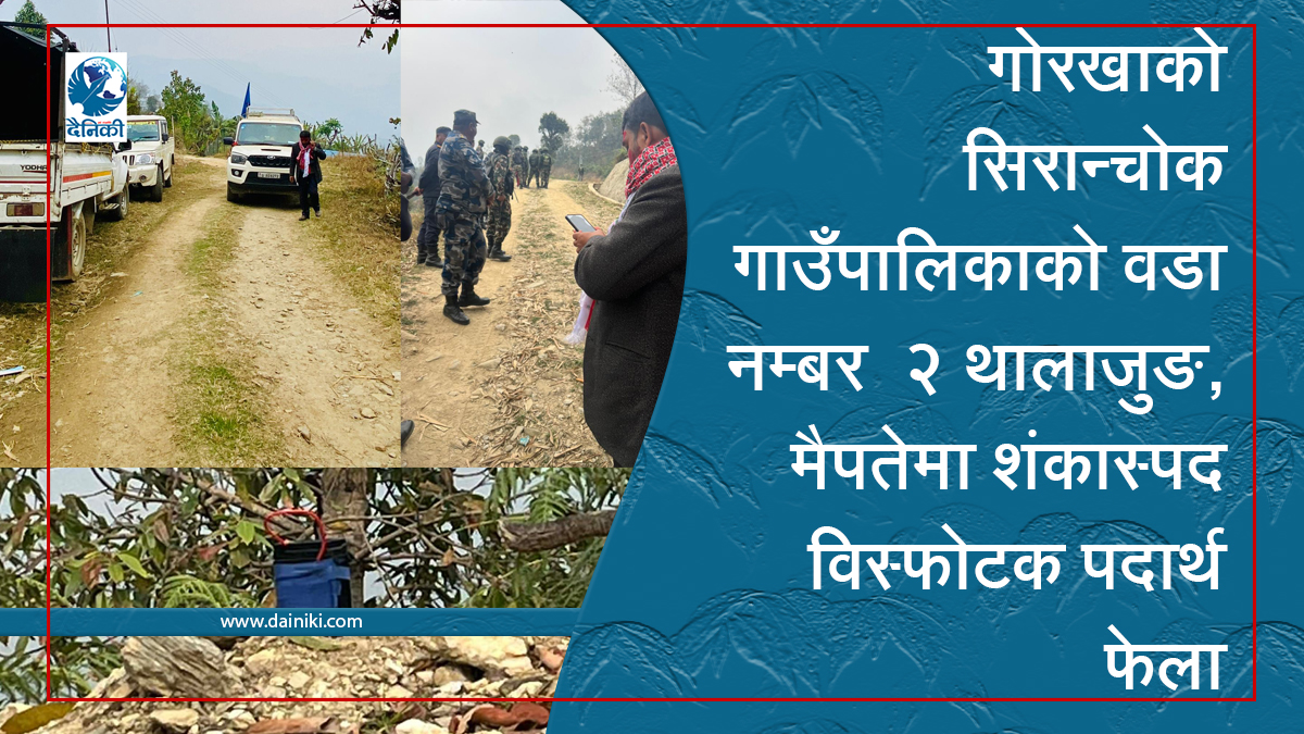 १६ फागुन, गोरखा । गोरखाको सिरान्चोक गाउँपालिकाको वडा नम्बर २ थालाजुङ, मैपतेमा शंकास्पद विस्फोटक पदार्थ फेला परेको छ । शुक्रबार दिउँसो निर्वाचन प्रचारमा हिँडिरहेको टोलीले विस्फोटक पदार्थ फेला पारेको हो ।