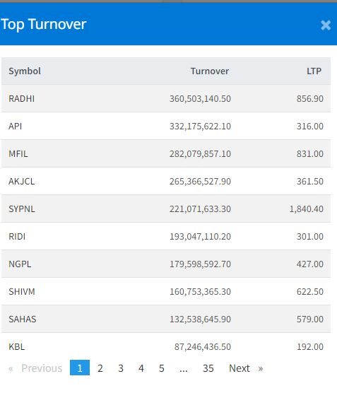 आज ३४१ कम्पनीको १ करोड ३१ लाख ९३ हजार कित्ता सेयर किनबेच हुँदा ५ अर्ब ६४ करोडको कारोबार भएको हो । आज राधि विद्युत कम्पनीको सर्वाधिक सेयर कारोबार भएको छ । कम्पनीको यस दिन ३६ करोड बढीको सेयर कारोबार भएको हो । त्यस्तै, यस दिन अपि पावर, मञ्जुश्री फाइनान्स, आखुखोला जलविद्युत र एसवाई प्यानलको सेयर सर्वाधिक कारोबार भएको हो ।