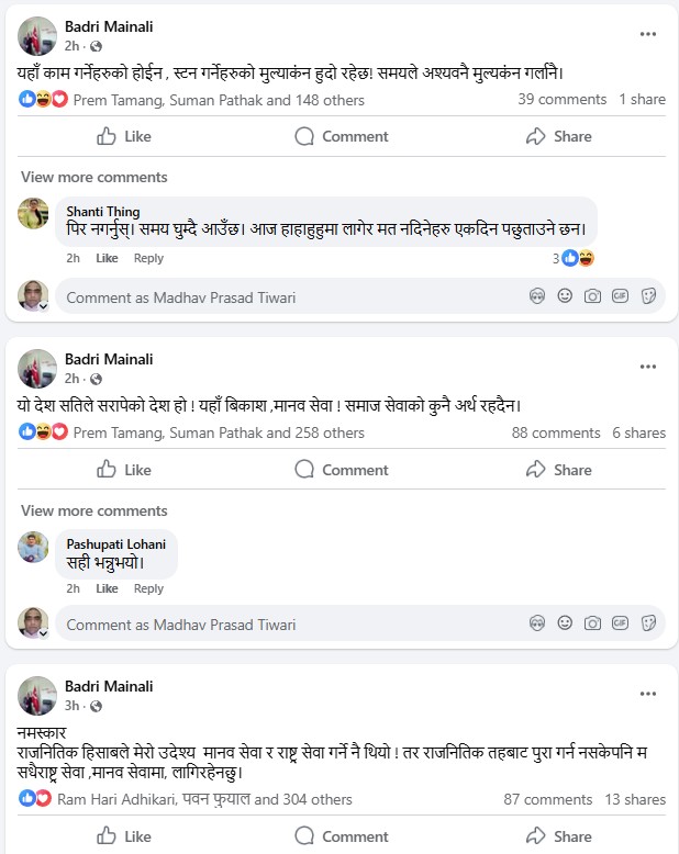 मैनालीको स्टेटस समेत पढेका नुवाकोट क्षेत्र नम्बर १ का एक जना नेताले दैनिकीसँग भने, ‘चुनावको प्रचारकै क्रममा समेत व्यापक अनुभुति हुनेगरी समाजसेवा गर्नुभएको मैनालीले कार्यकर्ताबाट चुनाव जित्ने रिपोर्टिङ र रेस्पोन्स पाउनुभएको थियो । अझै जहाँ बढी पार्टी प्रवेश र लगानी भयो त्यही ठाउँका वडाहरूमा सय मत कटाउन पनि मुस्किल देखियो । आफ्नै वडामा चुनाव जित्न सक्नुभएन । त्यसपछि असन्तुष्टि देखिएको हुनसक्छ ।’