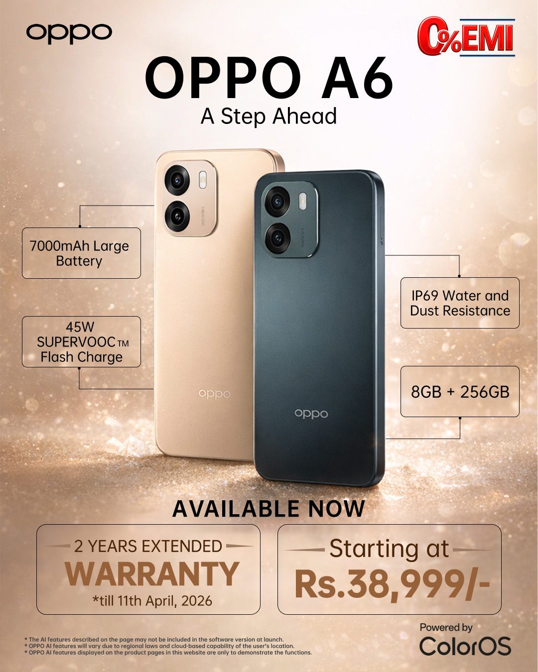 ओपो ए६ को अर्को प्रमुख विशेषता अन्डरवाटर फोटोग्राफी तथा भिडियोग्राफी क्षमता हो, जसलाई आइपी६९ वाटर तथा डस्ट रेसिस्टेन्स ले समर्थन गर्दछ । यसले प्रयोगकर्तालाई पानीभित्र समेत फोटो तथा भिडियो खिच्न सक्षम बनाउँछ। नेपालमा यो स्मार्टफोन ८जिबी + २५६जिबी भेरियन्टमा ३८,९९९ रुपैयाँ मूल्यमा उपलब्ध रहेको छ । ग्राहकहरूले ४०% डाउन पेमेन्टसहित ०% इएमआई सुविधा पनि प्राप्त गर्न सक्नेछन् । साथै, ११ अप्रिल २०२६ भित्र खरिद गर्ने ग्राहकहरूले एक्सटेन्डेड वारेन्टी समेत प्राप्त गर्नेछन्। यो स्मार्टफोन साफायर ब्लु र अरोरा गोल्ड गरी दुई रंगमा उपलब्ध रहेको छ ।