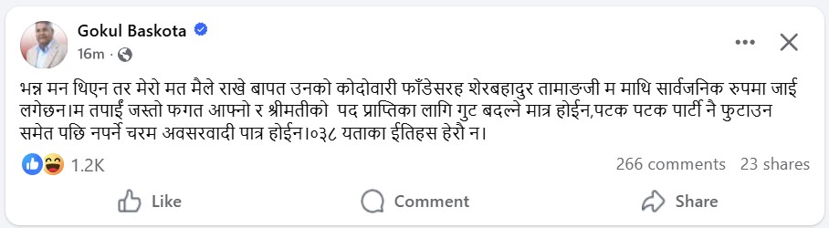 ३० फागुन, काठमाडौँ । नेकपा एमालेका नेताहरू व्यक्तिगत रूपमा आरोप प्रत्यारोपमा उत्रिनुभएको छ । नेता गोकुल बाँस्कोटाले फेसबुक मार्फत सार्वजनिक गरेको टिप्पणीमा आफ्नो निर्वाचन क्षेत्रसमेत जोगाउन नसक्ने नेताहरूले अध्यक्ष केपी ओलीलाई दोष देखाएर उम्किन नमिल्ने बताउनुभएको थियो । त्यसको जवाफमा शनिबार बिहान बाँस्कोटाले मुखभरीको जवाफ दिनुभएको छ ।