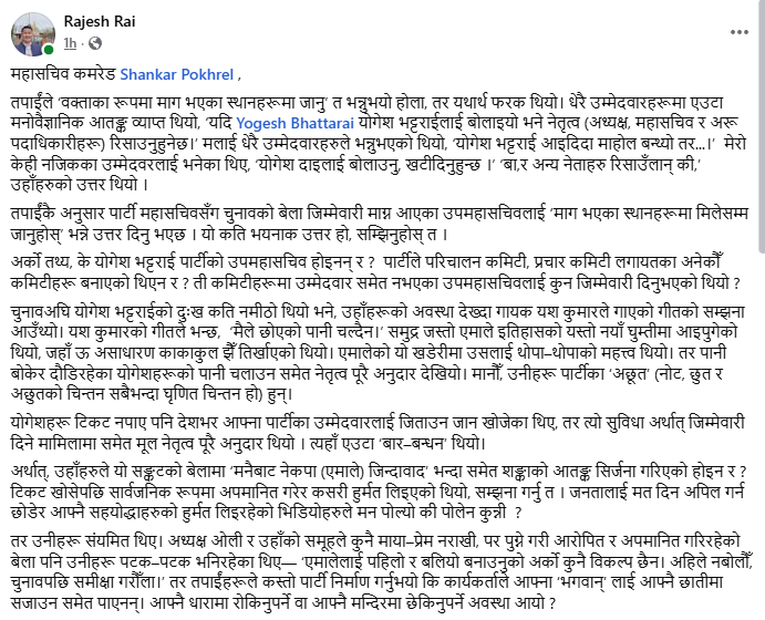 तपाईंकै अनुसार पार्टी महासचिवसँग चुनावको बेला जिम्मेवारी माग्न आएका उपमहासचिवलाई ‘माग भएका स्थानहरूमा मिलेसम्म जानुहोस्’ भन्ने उत्तर दिनु भएछ । यो कति भयनाक उत्तर हो, सम्झिनुहोस् त । अर्को तथ्य, के योगेश भट्टराई पार्टीको उपमहासचिव होइनन् र ? पार्टीले परिचालन कमिटी, प्रचार कमिटी लगायतका अनेकौँ कमिटीहरू बनाएको थिएन र ? ती कमिटीहरूमा उम्मेदवार समेत नभएका उपमहासचिवलाई कुन जिम्मेवारी दिनुभएको थियो ?