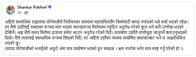 कुनै समय शंकर पोखरेलको भित्री सहयोगीको रूपमा काम गर्नुभएको राईले शनिबार योगेका बारेमा पोखरेलले भ्रम छर्न खोजेपछि लामो टिप्पणीसहित त्यसको प्रतिवादन गर्नुभएको छ । प्रश्न सुन्न नसकेर पत्रकारहरूलाई फेसबुकमा ब्लक गर्ने अभियानमा केन्द्रीत पोखरेलले शनिबार योगेशका बारेमा भन्नुभएको थियो, ‘अहिले सामाजिक सञ्जालमा योगेशजीले निर्वाचनका समयमा महासचिवसँग जिम्मेवारी माग्दा नपाएको भन्ने चर्चा भएको रहेछ। तर मैले उहाँलाई वक्ताका रूपमा माग भएका स्थानहरूमा मिलेसम्म गइदिन अनुरोध गरेको कुरा भने कतै उल्लेख भएको देखिनँ। अझ मैले समय मिलेमा दाङमा समेत आउन अनुरोध गरेको थिएँ। त्यसबेला उहाँले ताप्लेजुङ जानुपर्ने बताउनुभएको थियो। मैले त्यसलाई स्वाभाविक रूपमा लिएको थिएँ। तर अहिले उहाँका नाममा सम्प्रेषित समाचारबाट भने म आश्चर्यचकित भएको छु। (सायद योगेशजीको भनाईको अधुरो अंश मात्र सम्प्रेषण भएको हुन सक्दछ । भ्रम नपरोस भनेर मात्र स्पष्ट गर्नु परेको हो ।)’