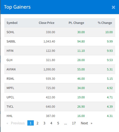 आज ३५० कम्पनीको ३ करोड ९५ लाख ४९ हजार कित्ता सेयर किनबेच हुँदा १४ अर्ब ३२ करोड ९६ लाख रुपैयाँको कारोबार भएको हो । यस दिन दुई कम्पनीकाे सेयरमा सकारात्मक सर्किट लागेकाे छ। यस दिन सोलु हाइड्रोपावर र सालपा विकास बैंकको सेयरमा सकारात्मक सर्किट लागेकाे हाे ।