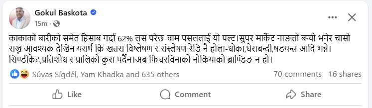 ३ चैत, काठमाडौँ । नेकपा एमालेका नेता गोकुल बाँस्कोटाले नेपाली वामपन्थीको हालत फिचरविनाको नोकियाको ब्राण्डजस्तो बनेको टिप्पणी गर्नुभएको छ । मंगलबार बिहान फेसबुक मार्फत टिप्पणी राख्दै उहाँले नेपाली वामपन्थीले यो चुनावमा ६२ प्रतिशत लस व्यहोरेको उल्लेख गर्नुभएको छ ।