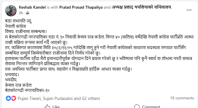कडेँलले विगत ४० वर्षदेखि नेपाली कांग्रेसप्रति आस्था राखी सक्रिय रूपमा कार्य गर्दै आएको उल्लेख गर्दै व्यक्तिगत कारणले राजीनामा दिनुपरेको बताउनुभएको छ । उहाँले मिति २०८२ चैत ५ गतेदेखि लागू हुने गरी पार्टीसँगको सम्पूर्ण सम्बन्ध अन्त्य गर्ने निर्णय लिएको जनाउनुभएको छ ।