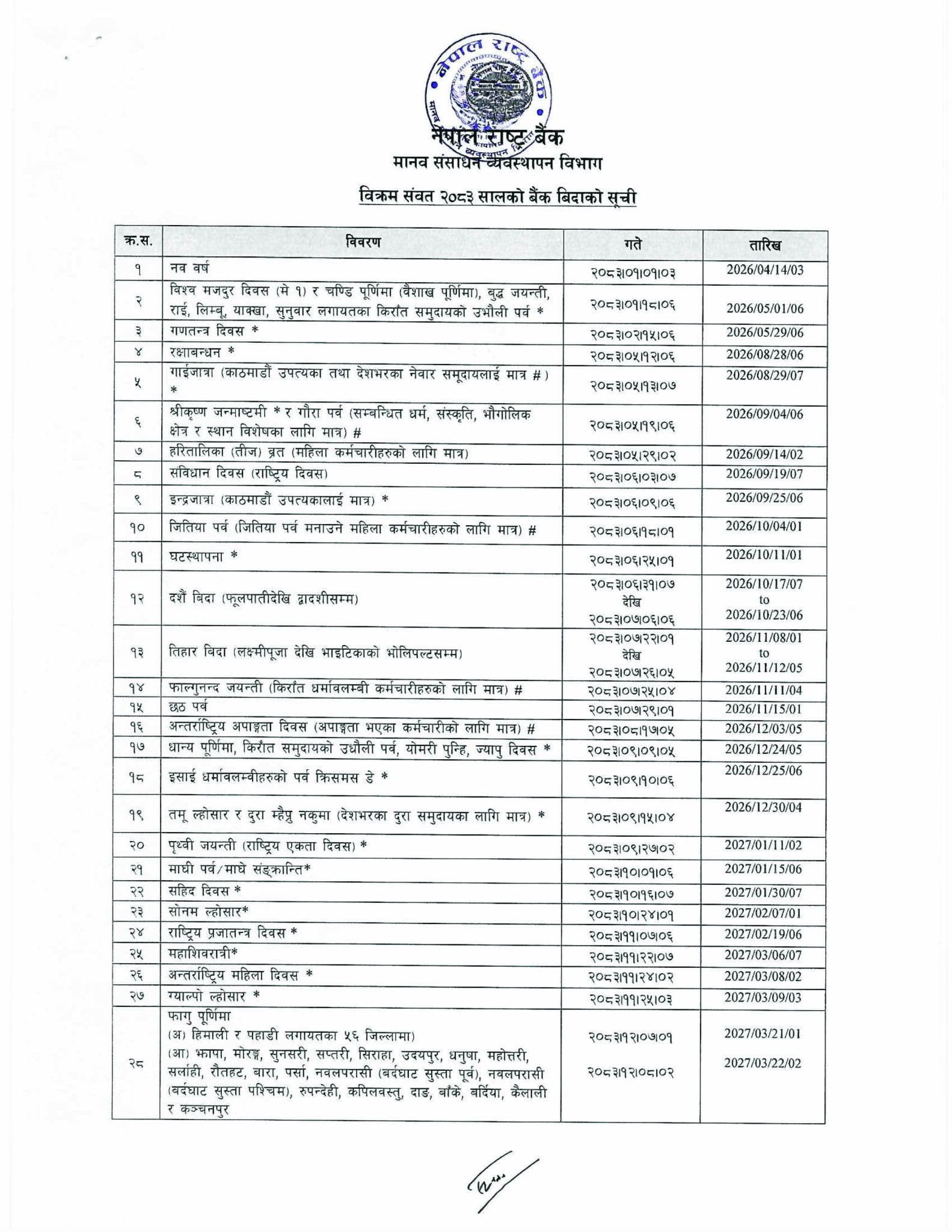 ८ चैत, काठमाडौं । नेपाल राष्ट्र बैंकले आगामी वर्ष विक्रम संवत् २०८३ सालका लागि बैंक बिदाको सूची सार्वजनिक गरेको छ । राष्ट्र बैंकको मानव संसाधन व्यवस्थापन विभागले एक सूचना जारी गर्दै २०८३ सालभरी हुने सार्वजनिक, धार्मिक तथा विभिन्न समुदायका पर्व बिदा र बैंकिङ कारोबार समयको बारेमा जानकारी गराएको हो ।