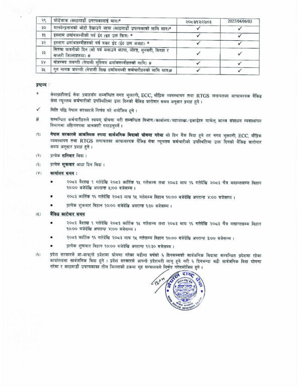 यसैगरी प्रत्येक शनिबार बैंक बिदा हुनेछ भने शुक्रबार आधा दिन बिदा हुनेछ। प्रदेश सरकारले आ–आफ्नो प्रदेशमा घोषणा गरेमा बढीमा वर्षको ६ दिनसम्मको सार्वजनिक बिदामा सम्बन्धित प्रदेशमा रहेका कार्यालयमा सार्वजनिक बिदा हुने र प्रदेश सरकारले आफ्नो प्रदेशभरि लागू हुने गरी ६ दिनभन्दा बढी सार्वजनिक बिदा घोषणा गरेमा र काठमाडौं उपत्यकाका तीन जिल्लाको हकमा गृह मन्त्रालयले निर्णय गरेबमोजिम हुने राष्ट्र बैंकले जनाएको छ।