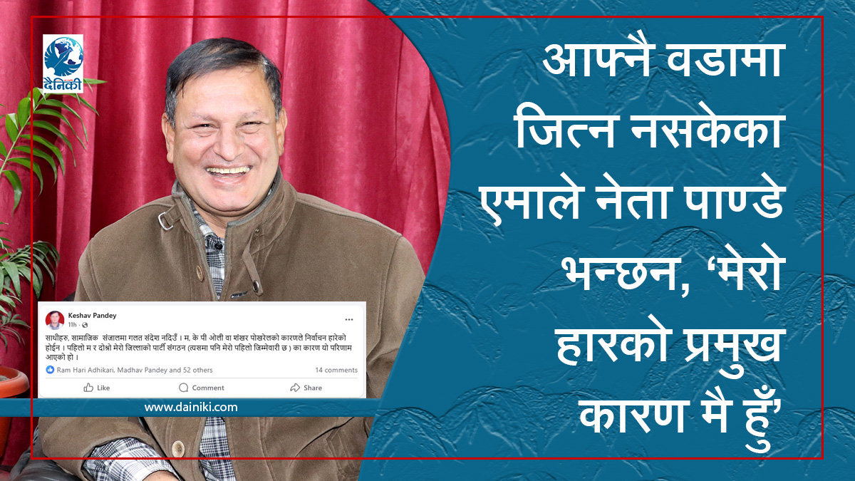 पाण्डेले भन्नुभएको छ, ‘साथीहरु, सामाजिक संजालमा गलत संदेश नदिउँ । म, के पी ओली वा शंखर पोखरेलको कारणले निर्वाचन हारेको होईन । पहिलो म र दोश्रो मेरो जिल्लाको पार्टी संगठन (त्यसमा पनि मेरो पहिलो जिम्मेवारी छ) का कारण यो परिणाम आएको हो ।’