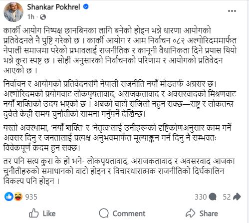 ‘कार्की आयोग निष्पक्ष छानबिनका लागि बनेको होइन भन्ने धारणा आयोगको प्रतिवेदनले नै पुष्टि गरेको छ’, महासचिव पोखरेलले लेख्नुभएको छ, ‘कार्की आयोग र आम निर्वाचन ०८२ अल्गोरिदममार्फत नेपाली समाजमा परेको प्रभावलाई राजनीतिक र कानुनी वैधानिकता दिने प्रयास थियो भन्ने कुरा स्पष्ट छ । सोही अनुसारको निर्वाचनको परिणाम र आयोगको प्रतिवेदन आएको छ ।’