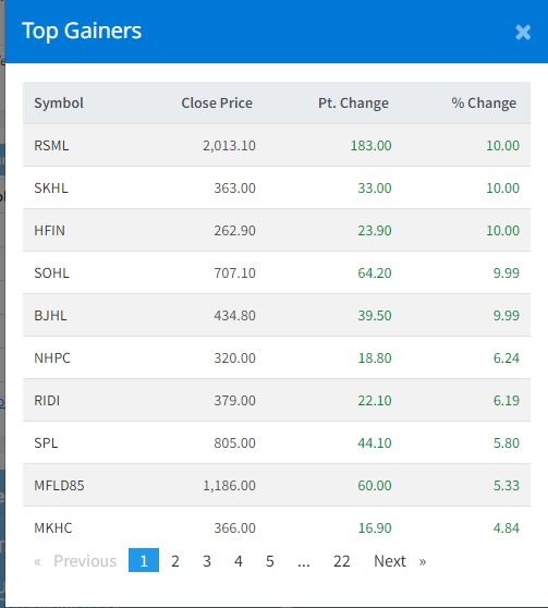 आज १७८ वटा कम्पनीहरुको सेयर मूल्य बढेको छ भने ८० वटाको मूल्यमा गिरावट आएको छ । ८ कम्पनीको मूल्य भने स्थिर रहेको छ । आज ५ कम्पनीकाे सेयर मूल्यमा सकारात्मक सर्किट लागेकाे छ । यस दिन सुपर खुदी हाइड्रोपावर, रिलायन्स स्पिनिङ मिल्स, सोलु हाइड्रोपावर, होटल फरेस्ट इन र र भुजुङ् हाइड्रोपावरको सेयर मूल्यमा सकारात्मक सर्किट लागेकाे हाे ।