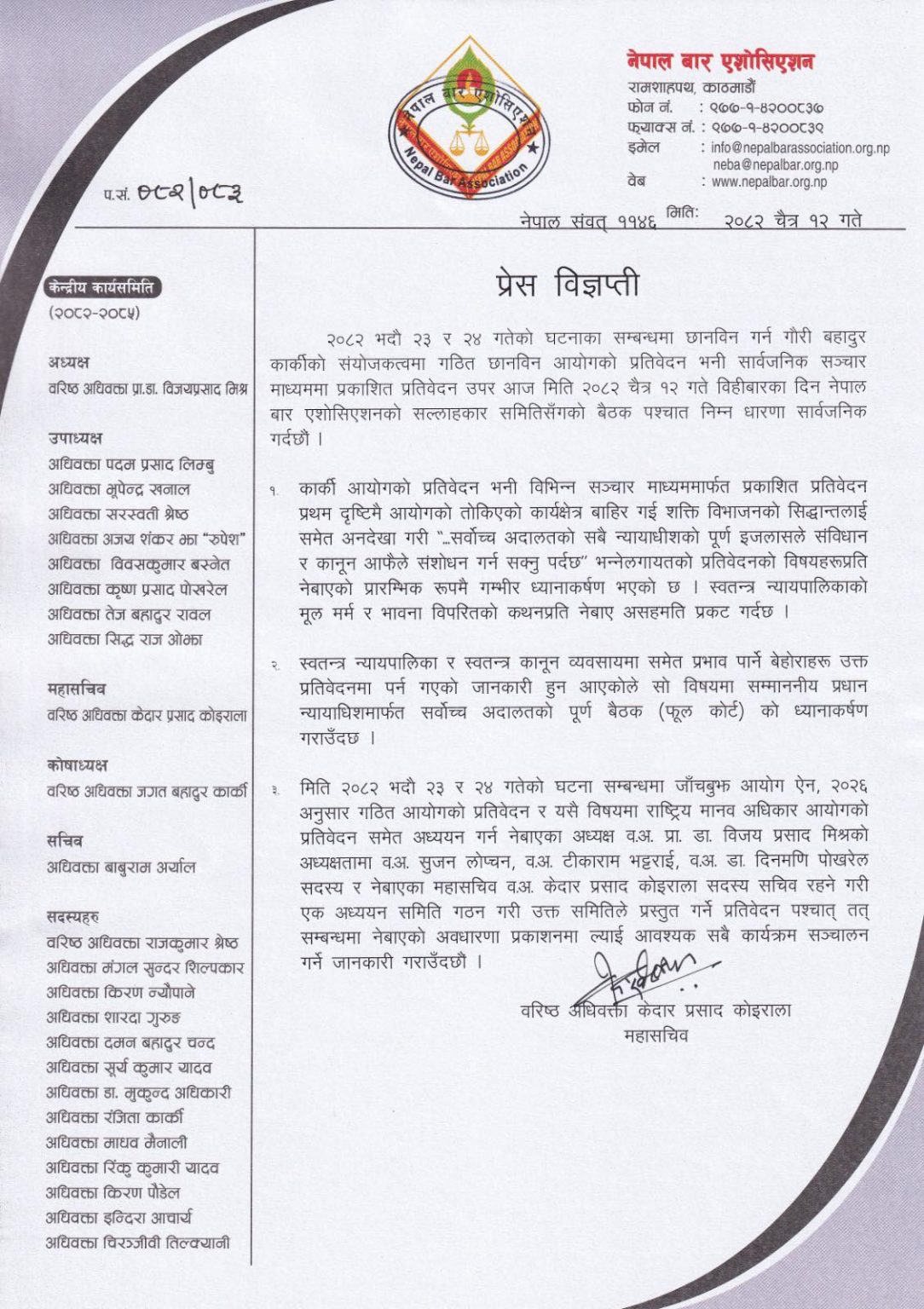 १२ चैत, काठमाडौं । नेपाल बार एसोसिएसनले गत भदौ २३ र २४ को घटनासम्बन्धी जाँचबुझ आयोग, २०८२ को प्रतिवेदनप्रति असहमति जनाएको छ ।