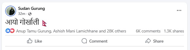 १४ चैत, काठमाडौँ । गृहमन्त्री सुदन गुरूङले एमाले अध्यक्ष केपी शर्मा ओलीको घरमा पक्राउका लागि प्रहरी पुगेपछि फेुसबुकमा ‘आयो गोर्खाली’ भन्दै स्टेटस लेख्नुभएको छ ।