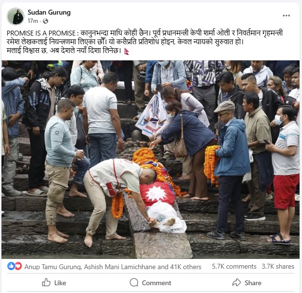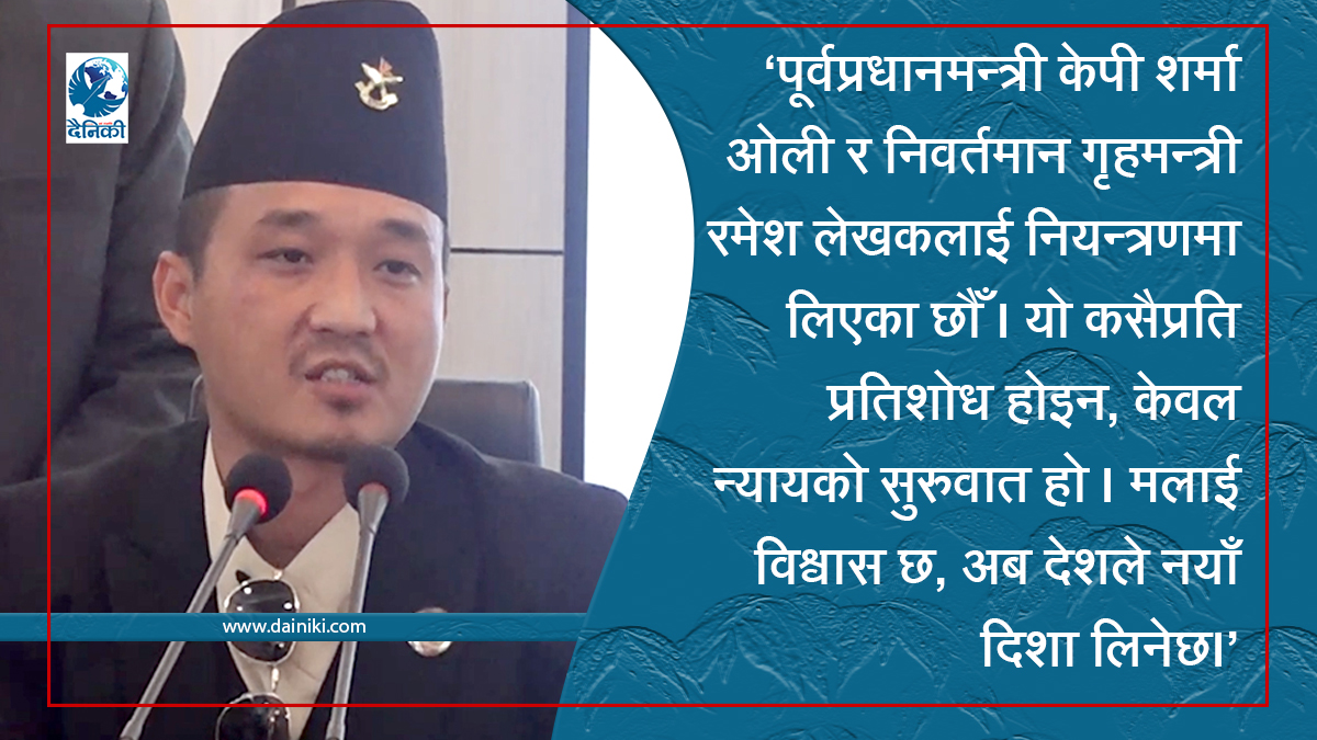 उहाँले फेसबुकमा लेख्नुभएको छ, ‘PROMISE IS A PROMISE : कानुनभन्दा माथि कोही छैन। पूर्व प्रधानमन्त्री केपी शर्मा ओली र निवर्तमान गृहमन्त्री रमेश लेखकलाई नियन्त्रणमा लिएका छौँ। यो कसैप्रति प्रतिशोध होइन, केवल न्यायको सुरुवात हो। मलाई विश्वास छ, अब देशले नयाँ दिशा लिनेछ।’