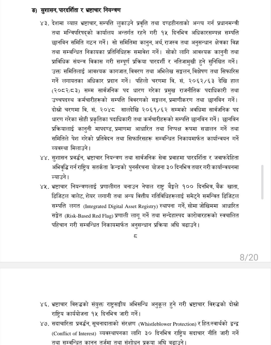 यस्तै, सुशासन प्रवर्द्धन र सार्वजनिक सेवा प्रवाहमा पारदर्शिता बढाउन राष्ट्रिय सतर्कता केन्द्रको पुनर्संरचना योजना ३० दिनभित्र तयार गरी कार्यान्वयनमा ल्याइनेछ। भ्रष्टाचार नियन्त्रणलाई प्रविधिमैत्री बनाउने उद्देश्यले नेपाल राष्ट्र बैंक को समन्वयमा १०० दिनभित्र ‘समन्वित डिजिटल सम्पत्ति दर्ता प्रणाली (Integrated Digital Asset Registry)’ स्थापना गरिने भएको छ। यस प्रणालीमार्फत बैंक खाता, डिजिटल वालेट, शेयर लगानी लगायतका वित्तीय गतिविधिहरू एकीकृत गरिनेछ। साथै जोखिममा आधारित ‘रेड फ्ल्याग’ प्रणाली लागू गरी सन्देहास्पद कारोबारको स्वचालित पहिचान र अनुसन्धान प्रक्रिया तीव्र बनाइने लक्ष्य राखिएको छ।
