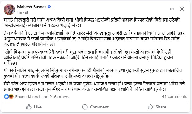 महेश बस्नेत फेसबुकमाः ‘म फरार भएको भन्ने प्रचार पूर्णतः भ्रामक र गलत हो’
