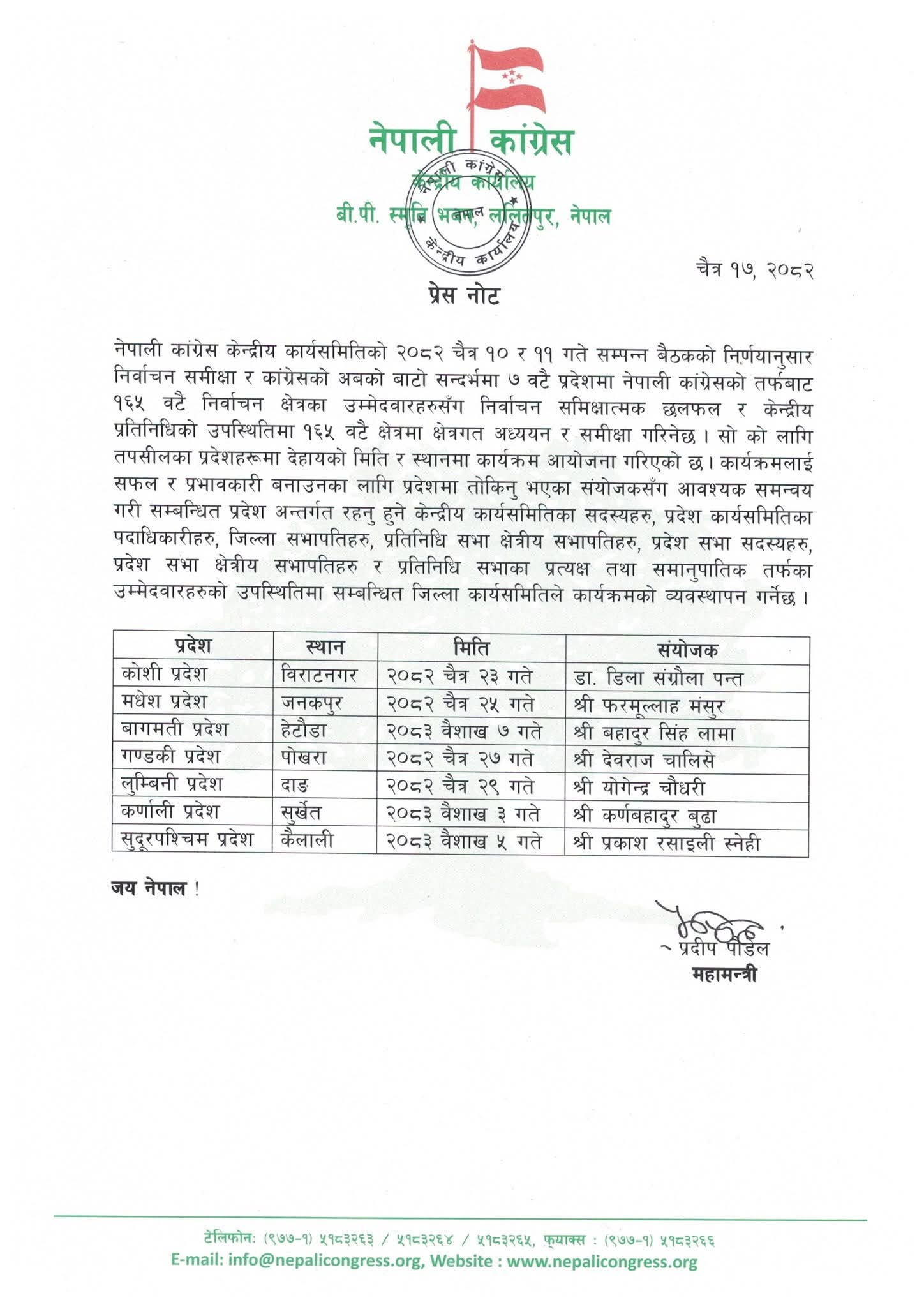 कांग्रेसको तर्फबाट १६५ वटै निर्वाचन क्षेत्रका उम्मेदवारहरूसँग निर्वाचन समीक्षात्मक छलफल र केन्द्रीय प्रतिनिधिको उपस्थितिमा १६५ वटै क्षेत्रमा क्षेत्रगत अध्ययन र समीक्षा गरिने कांग्रेसले जनाएको छ। यसका लागि सातै प्रदेशमा संयोजक तोकिएका छन्।