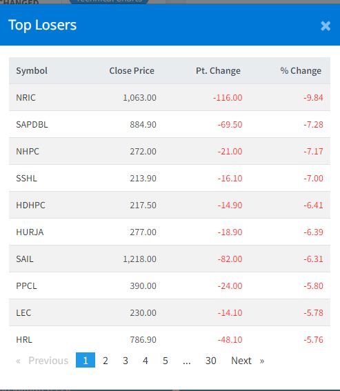 नेपाल रि–इन्स्योरेन्स कम्पनीका लगानीकर्ताहरूले यस दिन सर्वाधिक गुमाएका छन् । यस कम्पनीको सेयरमूल्य ९.८४ प्रतिशतले घटेको छ । त्यसैगरी, सप्तकोशी डेभलपमेन्ट बैंकको ७.२८ प्रतिशत, नेशनल हाइड्रोपाव्को ७.१७ प्रतिशत, शिवश्री हाइड्रोपावरको ७ प्रतिशतले सेयर मूल्य घटेको छ ।