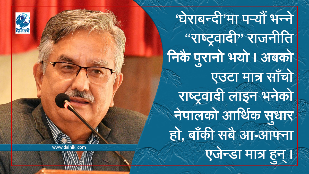 हिजो संसदमा “षड्यन्त्र”का लामा कथाहरू सुनियो। सेनाले जोगाएन, कर्मचारीले टेरेनन्, प्रविधिले हरायो – सबै दोष अरूलाई! हामी पनि दोषी छौं – यो वातावरण सिर्जना गर्न हाम्रै सरकारको अकर्मण्यता जिम्मेवार होइन र ? अब यो ‘घेराबन्दी’मा पर्यौं भन्ने “राष्ट्रवादी” राजनीति निकै पुरानो भयो। अबको एउटा मात्र साँचो राष्ट्रवादी लाइन भनेको नेपालको आर्थिक सुधार हो, बाँकी सबै आ-आफ्ना एजेन्डा मात्र हुन् ।आफ्नो कमजोरी लुकाएर कार्यकर्तालाई भ्रममा राखी अतिवादतिर धकेल्ने काम नगरौं। २३/२४ छानबिन हुनुपर्छ – तर हाम्रो राजनीति जनताको आकांक्षासँग मेल नखाएको यथार्थलाई बेवास्ता गर्नु हुँदैन ।