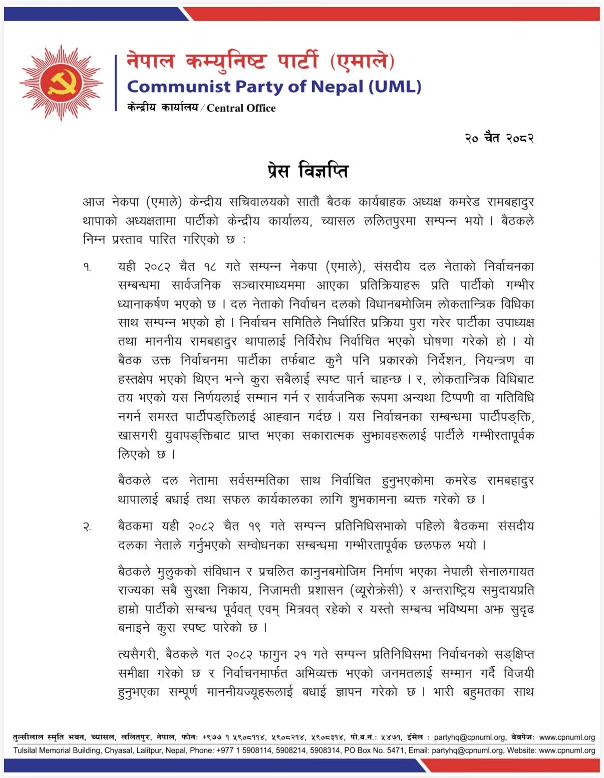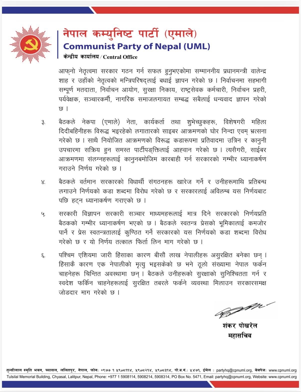 यसैगरी, एमालेले पार्टीका नेता तथा कार्यकर्ताविरुद्ध भइरहेको नियोजित साइबर आक्रमणको निन्दा गर्दै दोषीमाथि कडा कानुनी कारबाही गर्न सरकारसँग माग गरेको छ ।