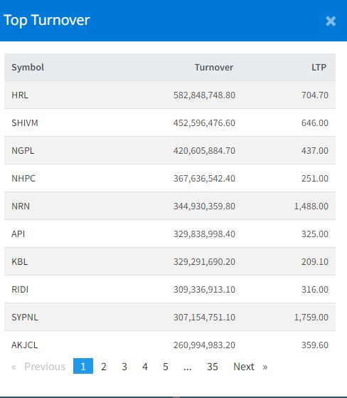आज हिमालयन रिइन्स्योरेन्सको सेयर सर्वाधिक कारोबार भएको छ । कम्पनीको ५८ करोड २८ लाख ४८ हजार रुपैँया बराबरको कारोबार भएको छ । त्यस्तै, शिवम् सिमेन्टको ४५ करोड २५ लाख ९६ हजा,ङादी ग्रुप पावरको ४२ करोड ६ लाख ५ हजार रुपैँया, नेशनल हाइड्रोपावर कम्पनीको ३६ करोड ७६ लाख ३६ हजार रुपैयाँ, एनआएन इन्फ्रास्ट्रक्चरको ४९ करोड ४९ लाख ३० हजार रुपैयाँको कारोबार भएको हो ।