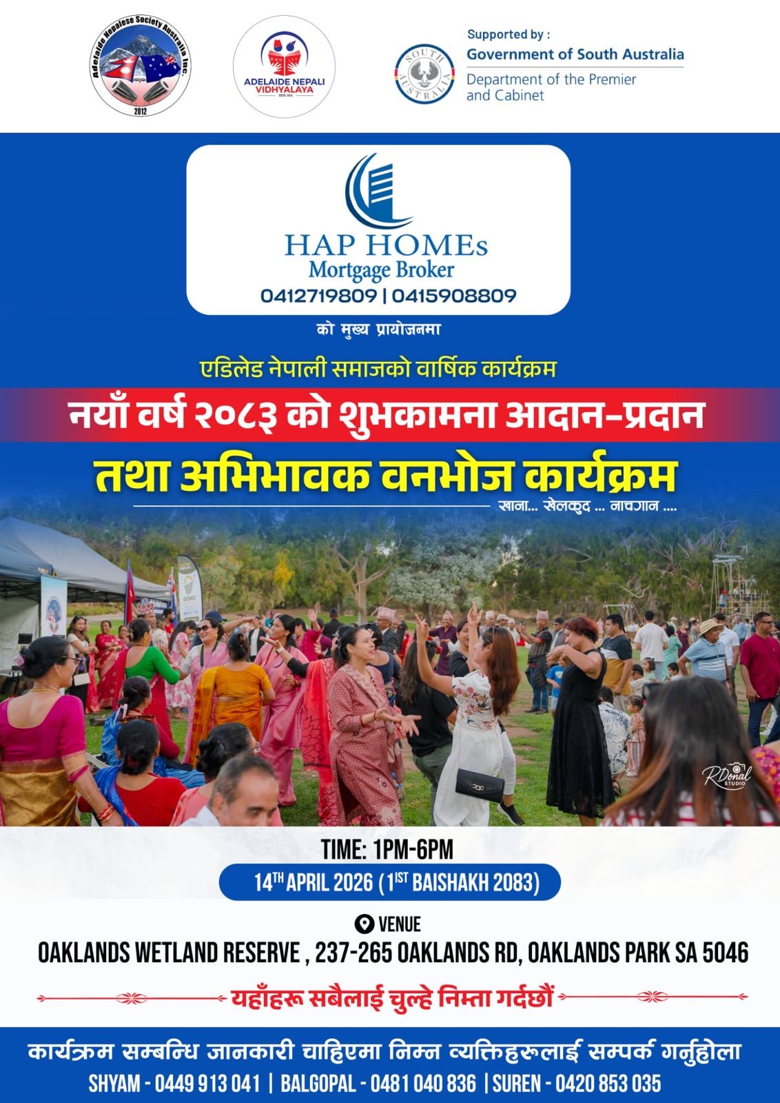 एडिलेड । एडिलेड नेपाली समाजको आयोजनामा बैशाख १ तदनुसार अप्रिल १४ मा नयाँ बर्षको शुभकामना आदान प्रदान तथा अभिभावक वनभोज हुने भएको छ ।