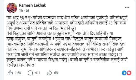 लेखकले फेसबुकमा लेख्नुभएको छ, ‘गत भाद्र २३ र २४ गतेको घटनाका सन्दर्भमा गठित आयोगको पूर्वाग्रही, प्रतिशोधपूर्ण, अपूर्ण र अप्रमाणित प्रतिवेदनको आधारमा फौजदारी अभियोग लगाई १३ दिनसम्म नियन्त्रणमा राखे पनि अन्ततस् म रिहा भएको छु ।’