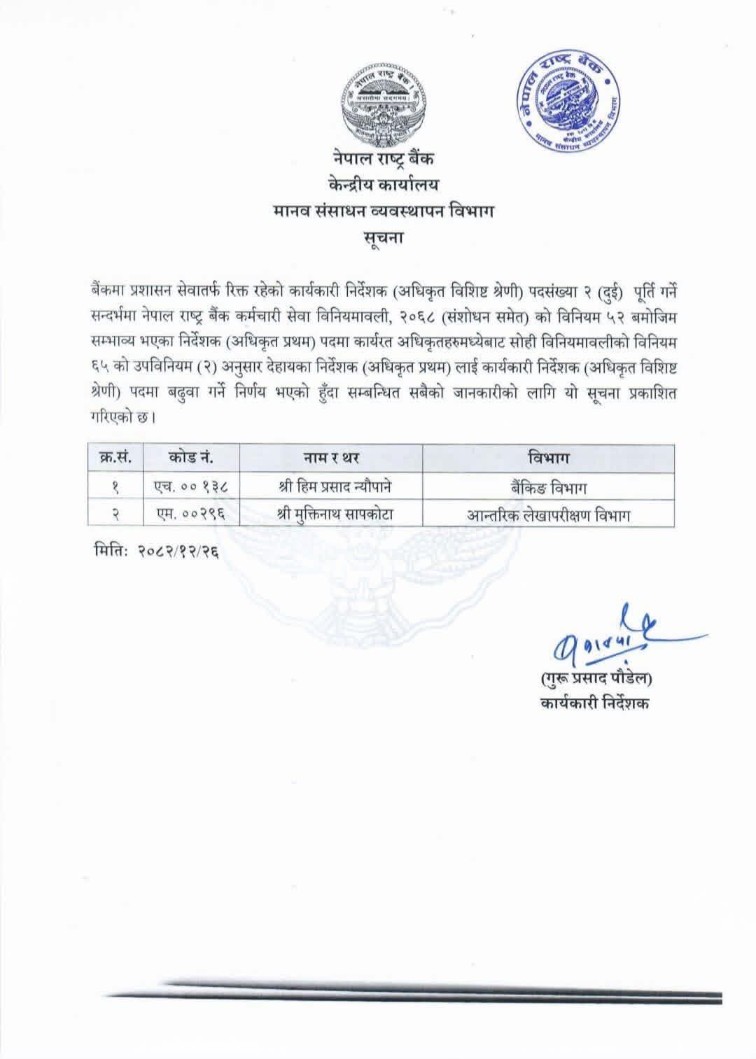राष्ट्र बैंकको मानव संसाधन व्यवस्थापन विभागले एक सूचना जारी गर्दै दुई निर्देशकलाई कार्यकारी निर्देशकमा बढुवा गरेको जानकारी दिएको हो। बैंकमा प्रशासन सेवातर्फ रिक्त रहेको कार्यकारी निर्देशक पदसंख्या दुई पूर्ति गर्ने सन्दर्भमा नेपाल राष्ट्र बैंक कर्मचारी सेवा विनियमावली, २०६८ (संशोधन समेत) को विनियम ५२ बमोजिम सम्भाव्य भएका निर्देशक (अधिकृत प्रथम) पदमा कार्यरत अधिकृतहरूमध्येबाट सोही विनियमावलीको विनियम ६५ को उपविनियम (२) अनुसार निर्देशकलाई कार्यकारी निर्देशक पदमा बढुवा गरेको हो।