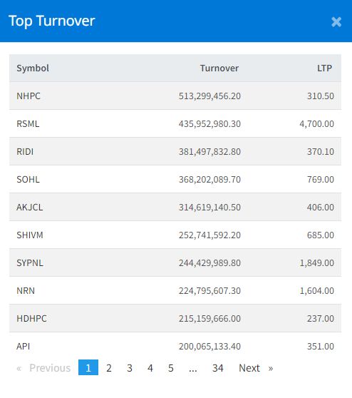 आज नेशनल हाइड्रोपावरको सेयर सर्वाधिक कारोबार भएको छ । कम्पनीको यस दिन ५१ करोड ३२ लाख ९९ हजार रुपैँया बराबरको कारोबार भएको छ । त्यस्तै, रिलायन्स स्पिनिङ मिल्सकाे ५३ करोड ५९ लाख ५२ हजार रुपैयाँ, रिडी पावर कम्पनीको ३८ करोड १४ लाख ९७ हजार रुपैँया, सोलु हाइड्रोपावरको ३६ करोड ८२ लाख २ हजार रुपैयाँ र आँखुखोला जलविद्युत कम्पनीको ३१ करोड ४६ लाख १९ हजार रुपैयाँको कारोबार भएको हो ।
