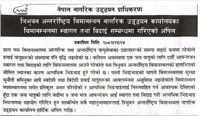 ‘कतिपय अवस्थामा एकजना यात्रुका लागि दशौँ आफन्तजन स्वागत तथा बिदाइका लागि विमानस्थलमा आउने गरेकाले यस त्रिभुवन अन्तर्राष्ट्रिय विमानस्थलको हाताभित्रको सीमित स्थानका कारण अत्यधिक भिडभाड हुने गरेको छ, अत्यधिक भिडभाड नियन्त्रणमा सहयोग गरिदिन हुन सम्बन्धित सबै महानुभावलाई त्रिभुवन अन्तर्राष्ट्रिय विमानस्थल नागरिक उड्डयन कार्यालय हार्दिक अपिल गर्दछ,’ सूचनामा उल्लेख छ ।