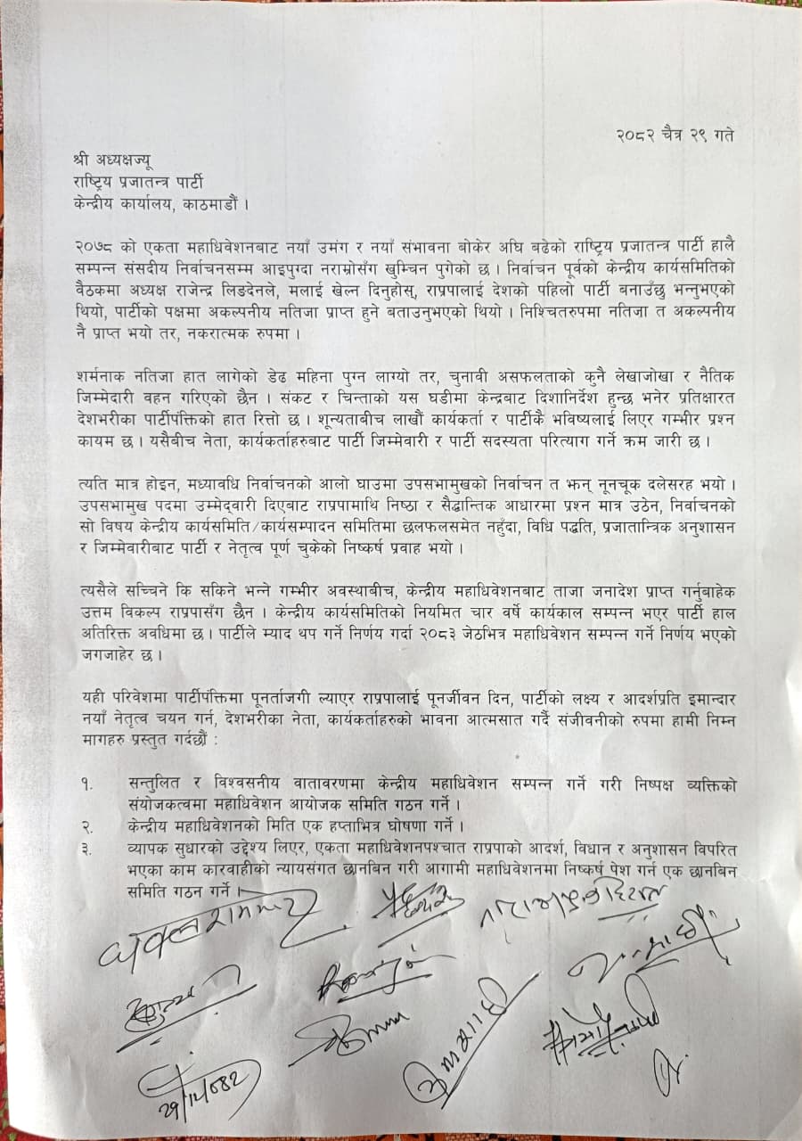 लिङ्देनलाई पत्र लेखेर एक सातााभित्रै महाधिवेशन मिति तय गर्न भनेका छन् । निर्वाचनबाट प्राप्त नतिजाको विश्लेषण गरेको राणा पक्षधरको बैठकले पार्टी ‘ सच्चिने कि सकिने’ गम्भीर अवस्थामा रहेको विश्लेषण गरेको छ । महाधिवेशनको माग गर्दै भनिएको छ,‘केन्द्रीय महाधिवेशनबाट ताजा जनादेश प्राप्त गर्नुबाहेक उत्तम विकल्प राप्रपासँग छैन । केन्द्रीय कार्यसमितिको नियमित चार वर्षे कार्यकाल सम्पन्न भएर पार्टी हाल अतिरिक्त अवधिमा छ । पार्टीले म्याद थप गर्ने निर्णय गर्दा २०८३ जेठभित्र महाधिवेशन सम्पन्न गर्ने निर्णय भएको जगजाहेर छ ।’